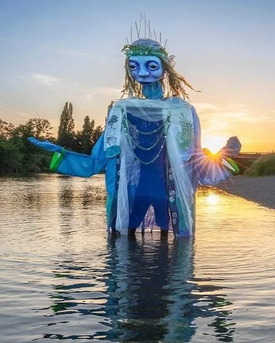 Kim sees himself as an arts activist. He says: '“What do you do in an environmental crisis with a degree in advertising and 25 years experience as a professional street performer, puppeteer, artist and maker? Supporting and amplifying the actions of others, and dreaming into a better more connected world. Add to that a relatively late awakening to the spiritual aspects of this magical world, a keen interest in healthy human culture, and a lot of experience ‘being’ an animal. My answer is still unfolding, but the project that is currently leading my enquiry is the River Goddess, a large puppet I created for Save the Wye, my local river action group. Embodying a deity is in itself an interesting subject, but more interesting is the reaction to people we meet and the very real experience they are left with.’